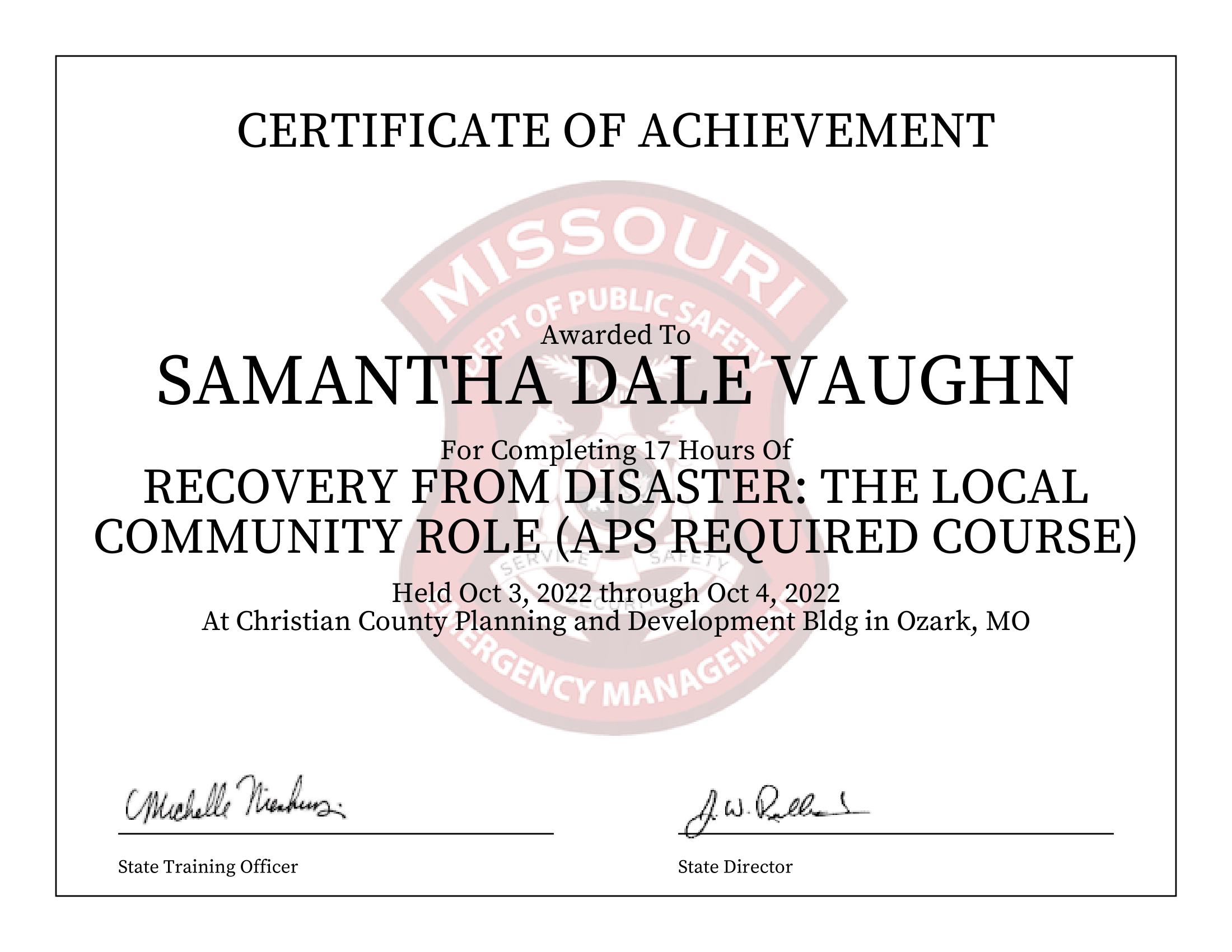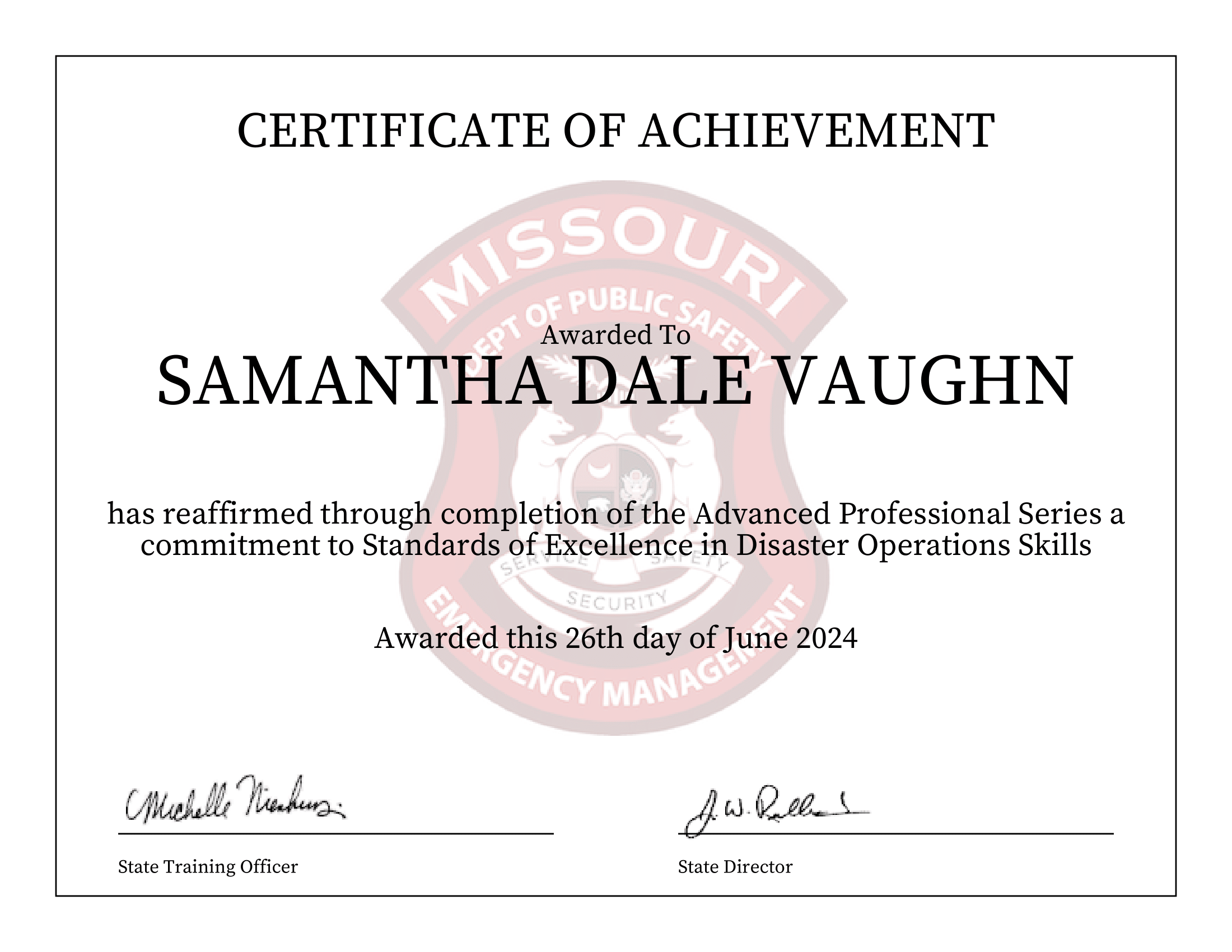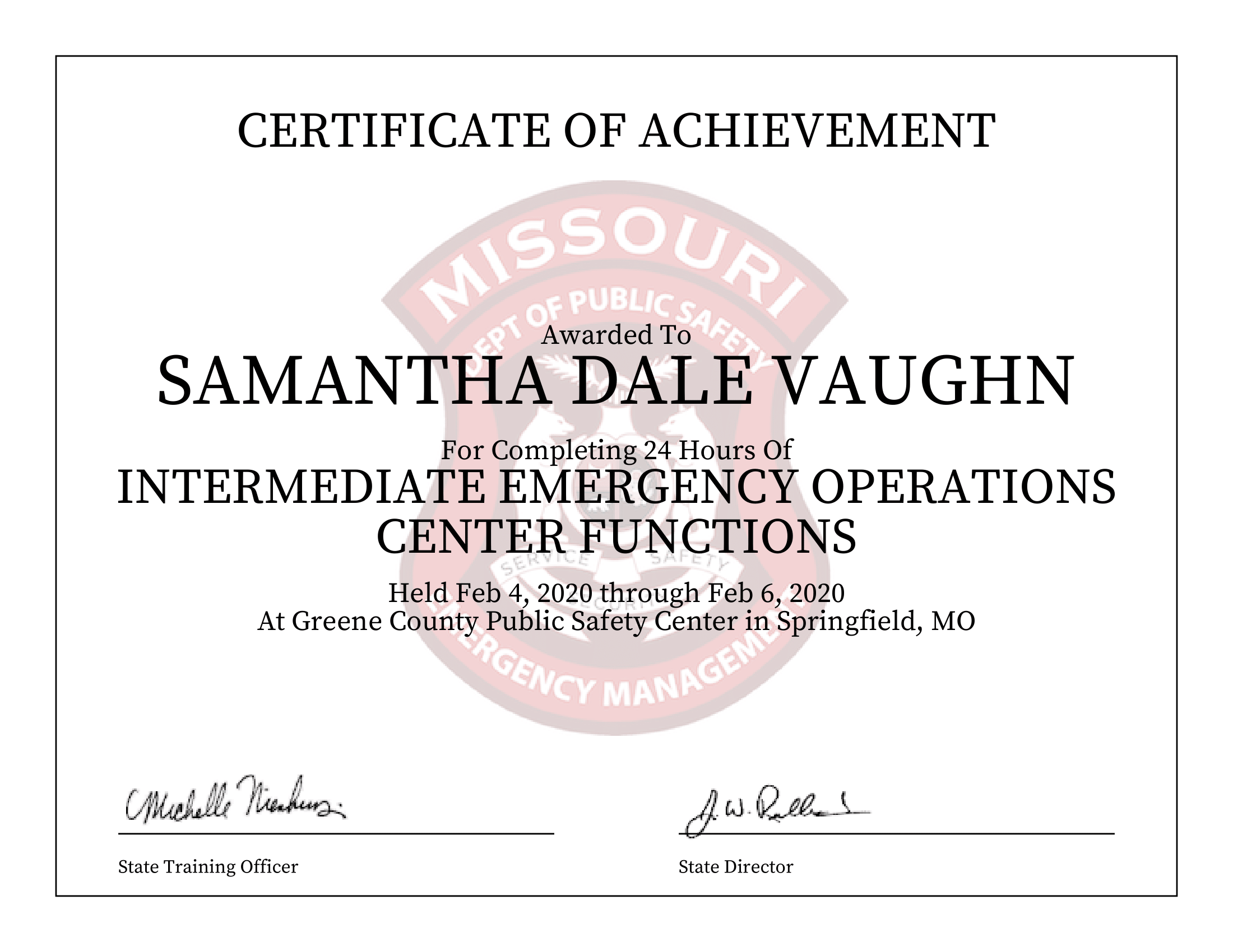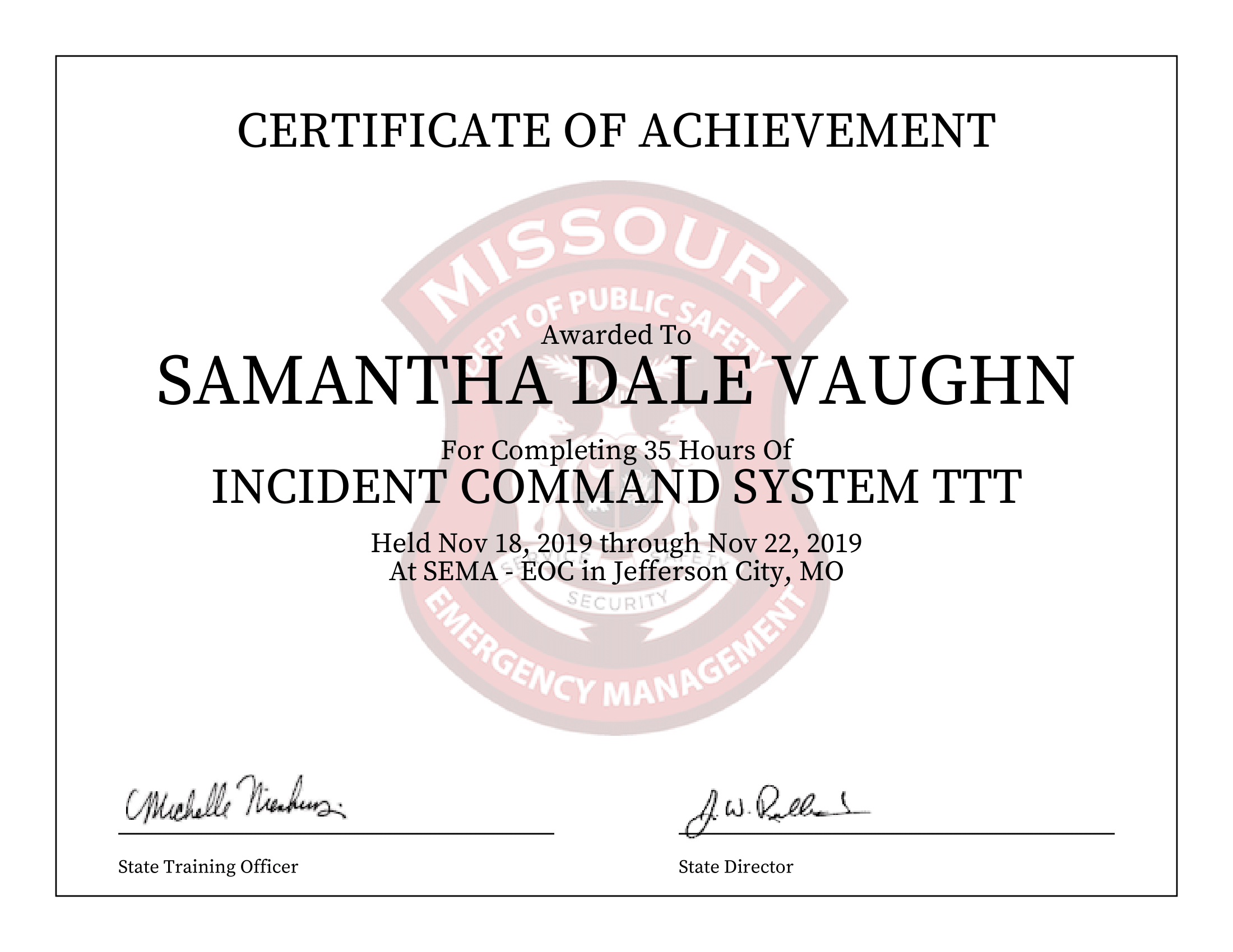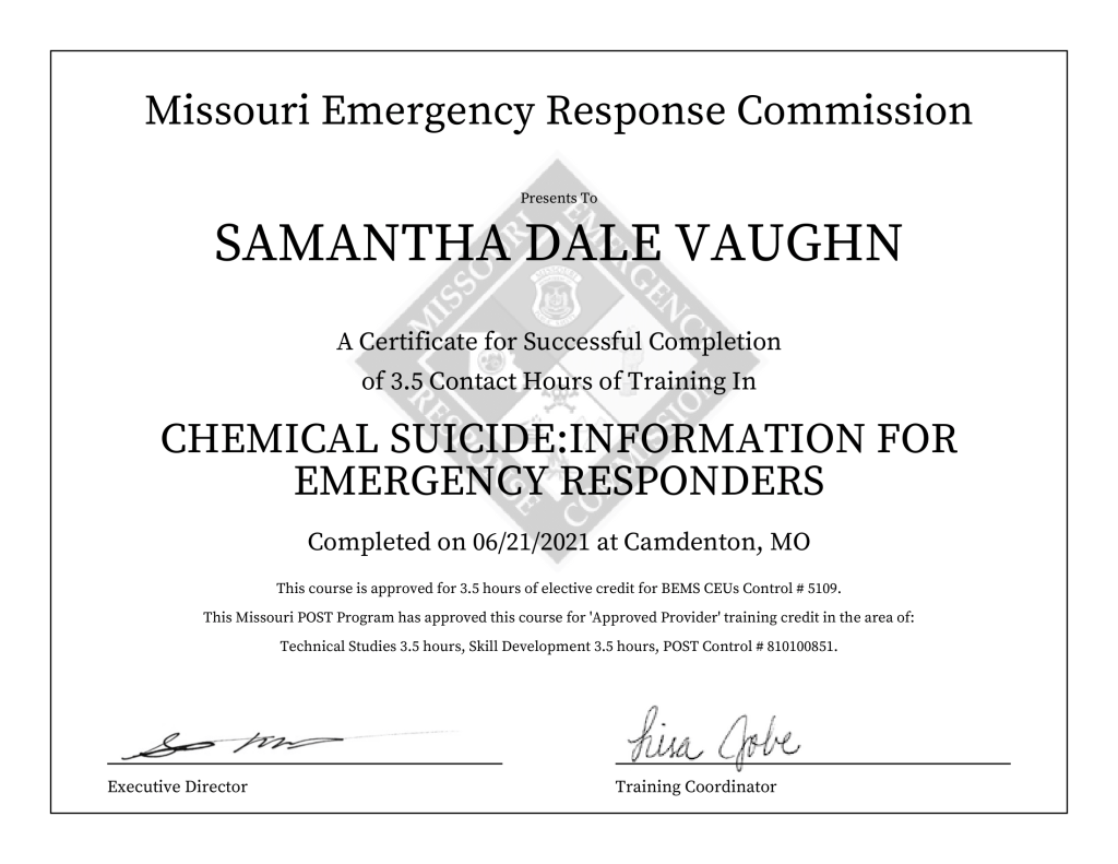 *Samantha’s certificates fall under her maiden name Dale, former married name Henley, and/or her new last name Dale Vaughn.