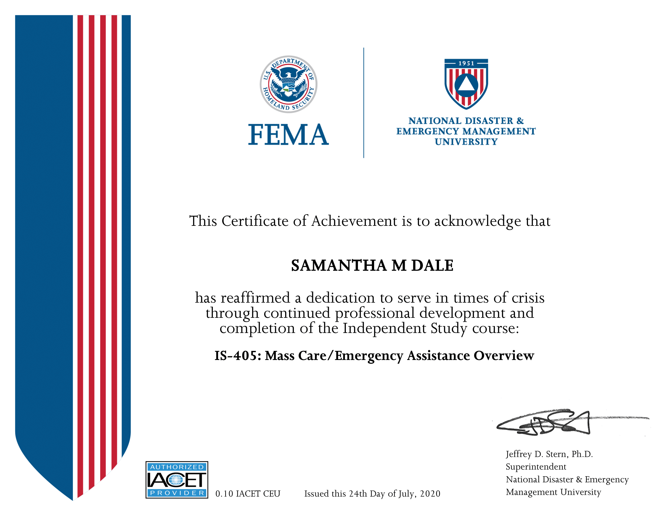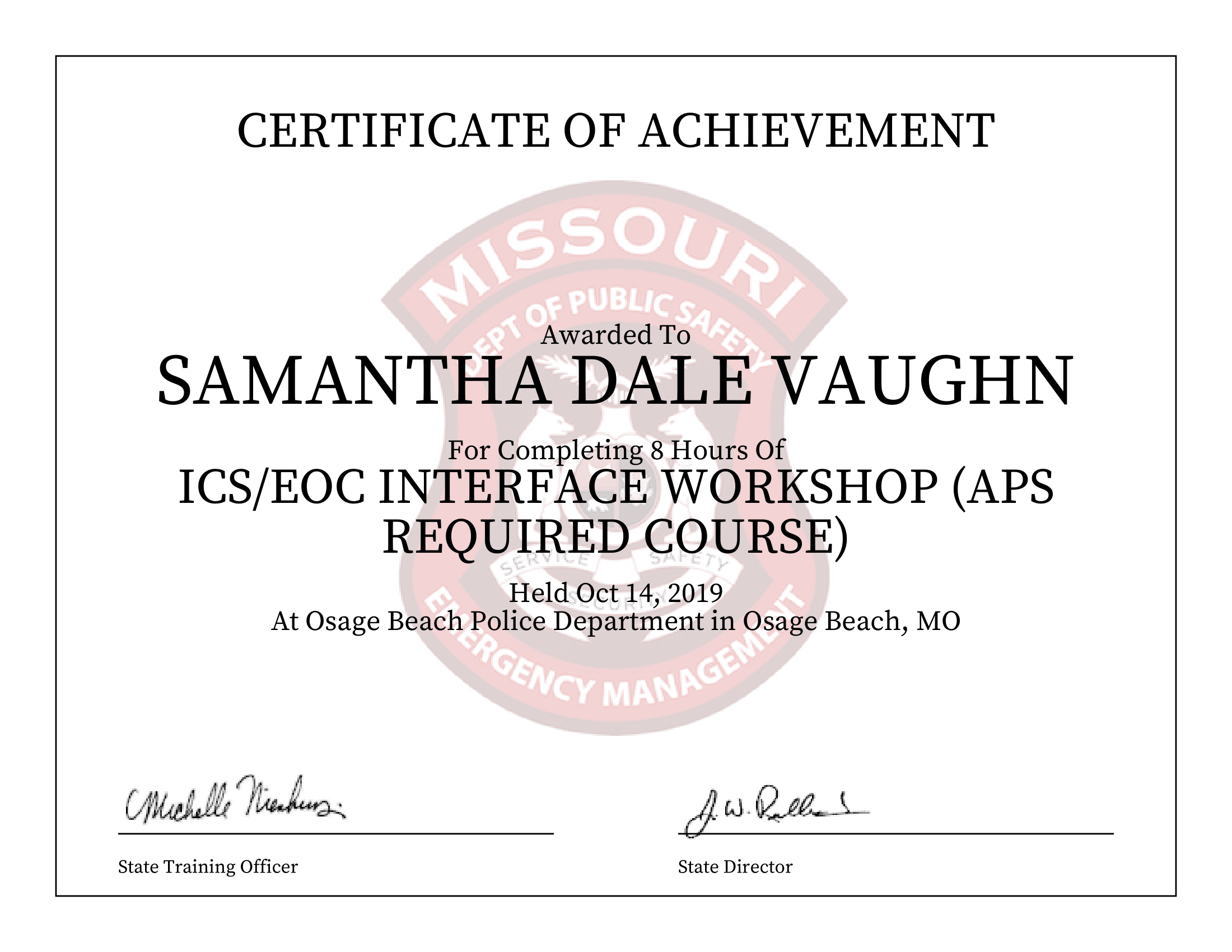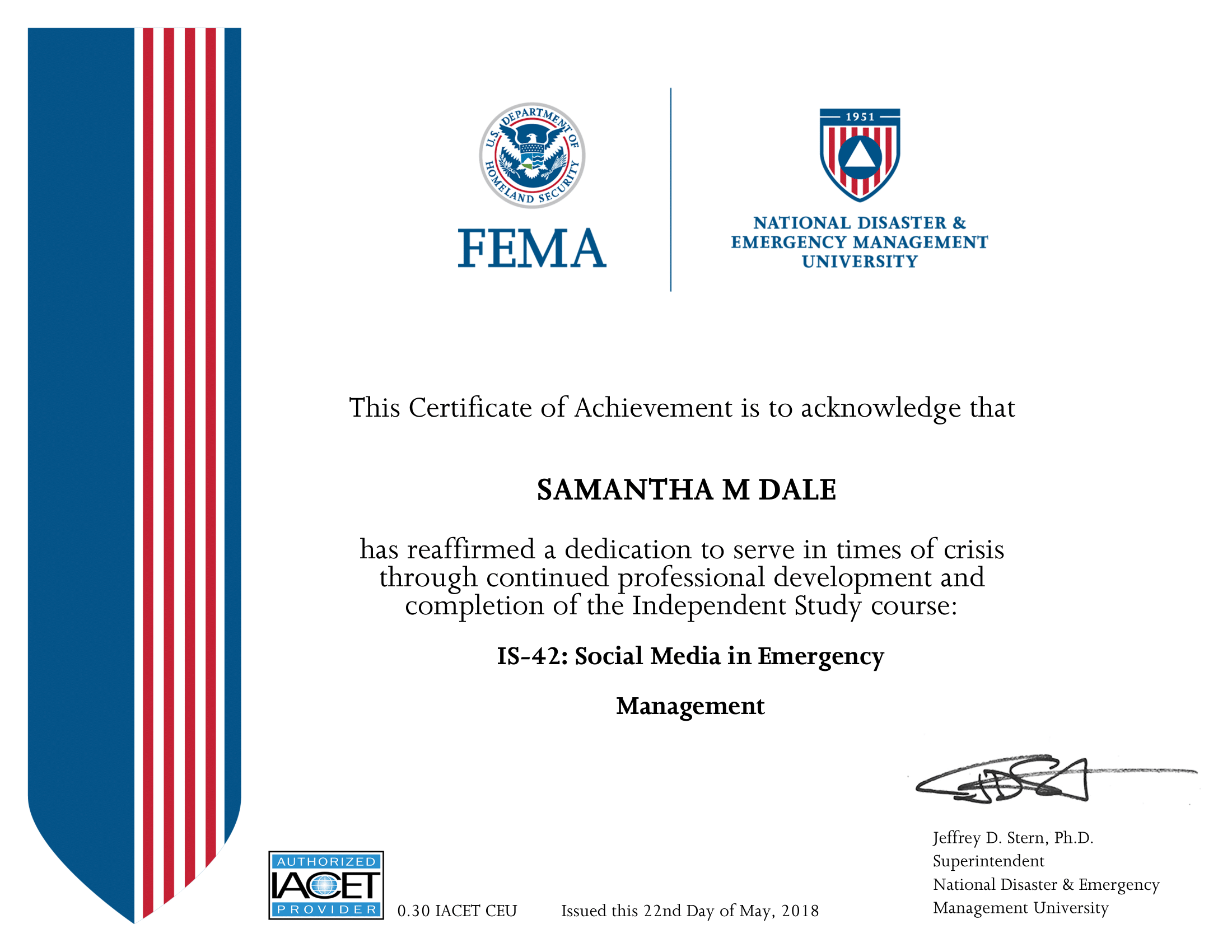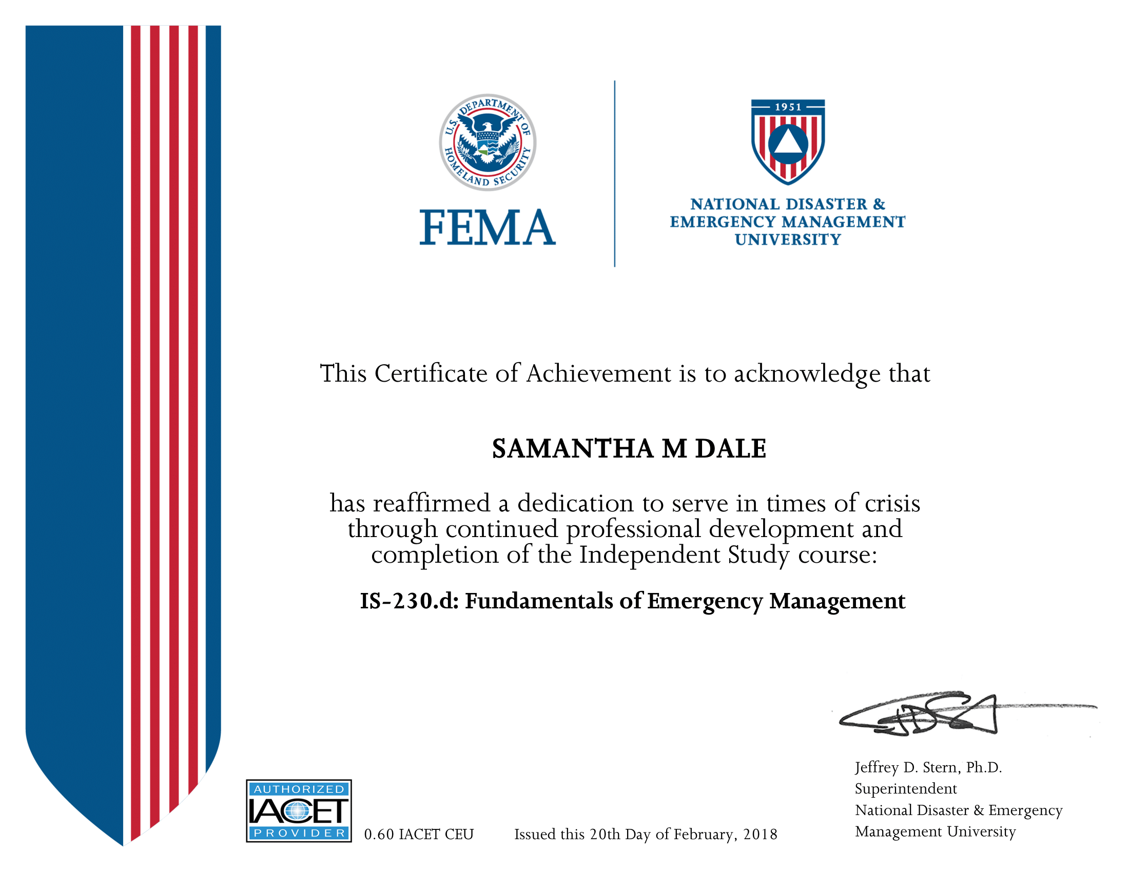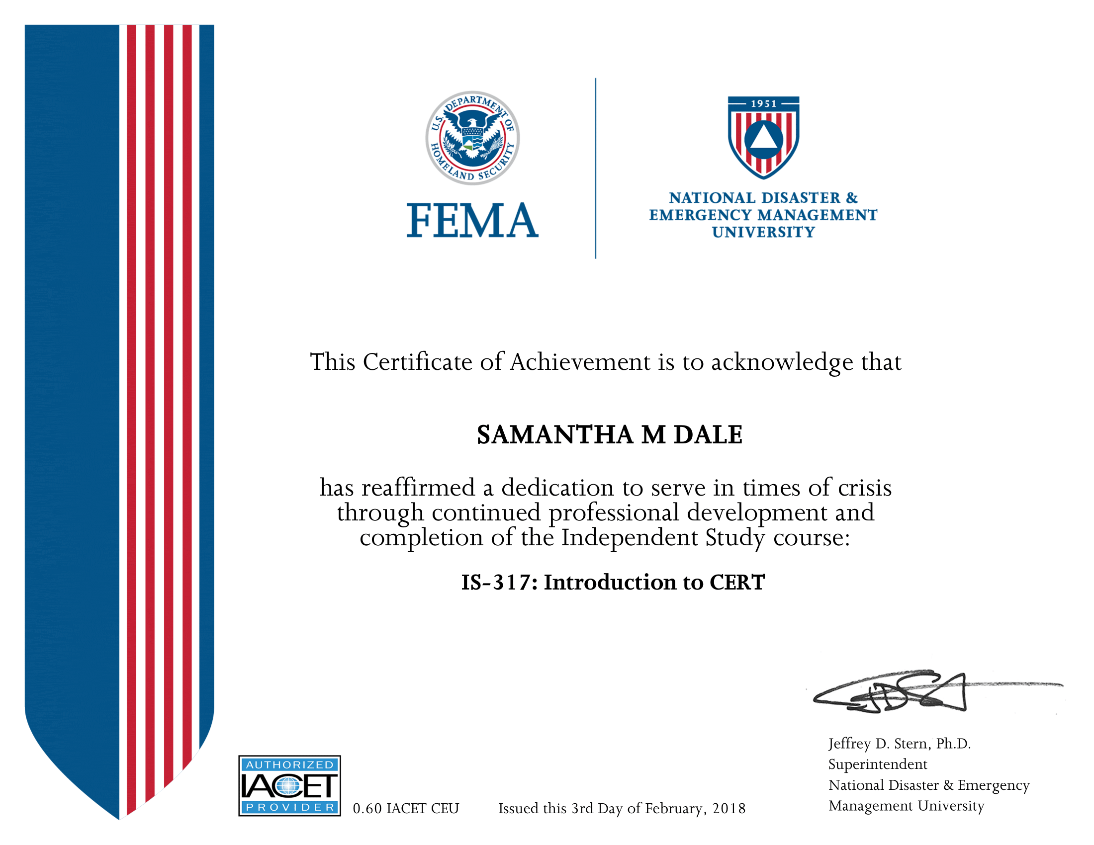 *Samantha’s certificates fall under her maiden name Dale, former married name Henley, and/or her new last name Dale Vaughn.