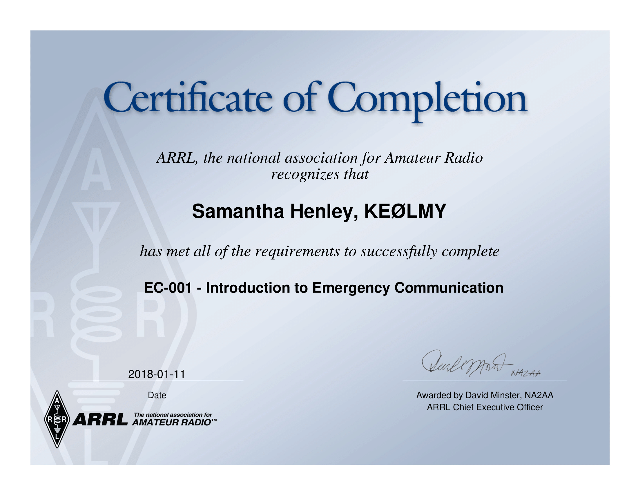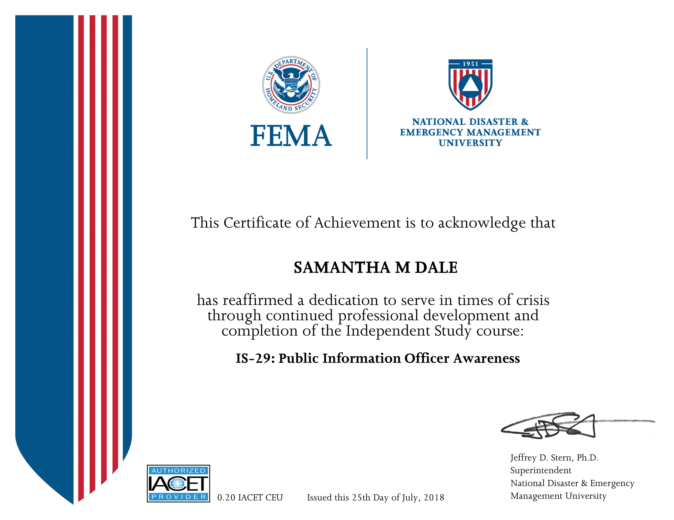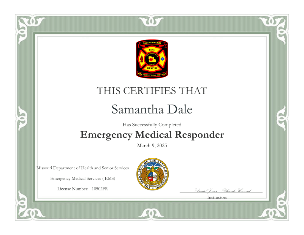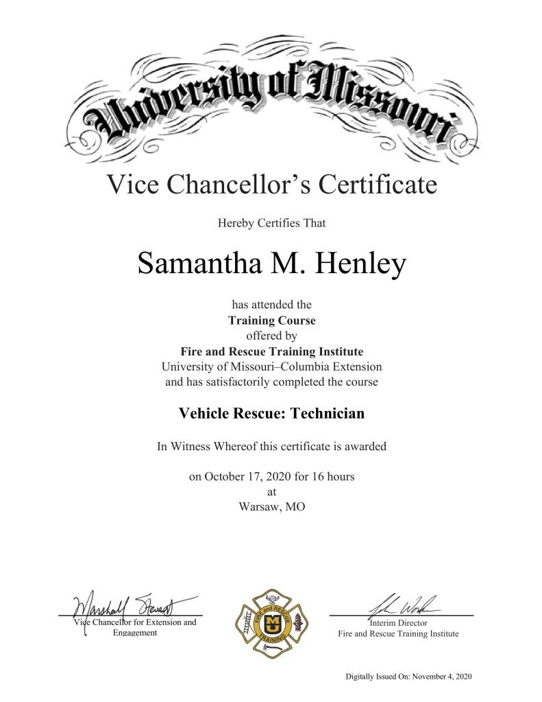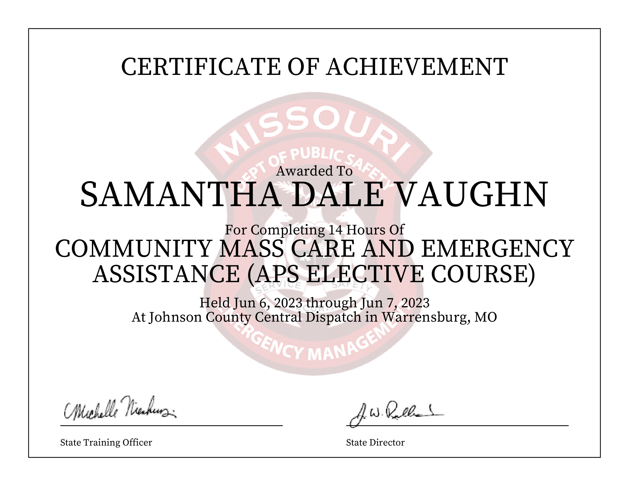 *Samantha’s certificates fall under her maiden name Dale, former married name Henley, and/or her new last name Dale Vaughn.
