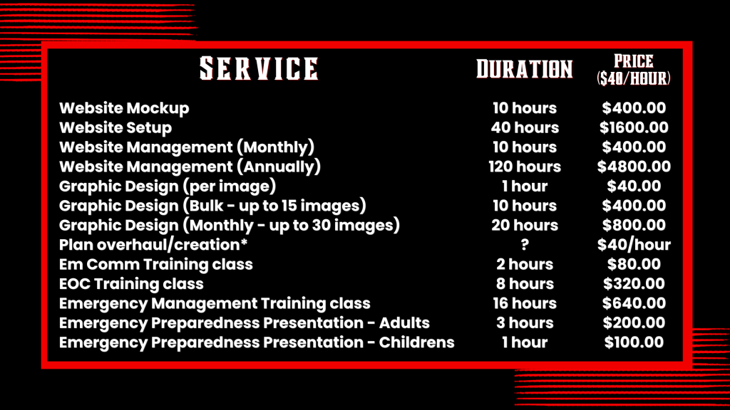 Below you will find some basic pricing for services. Each client will receive a package catered specifically for their needs and will be provided with a detailed quote.